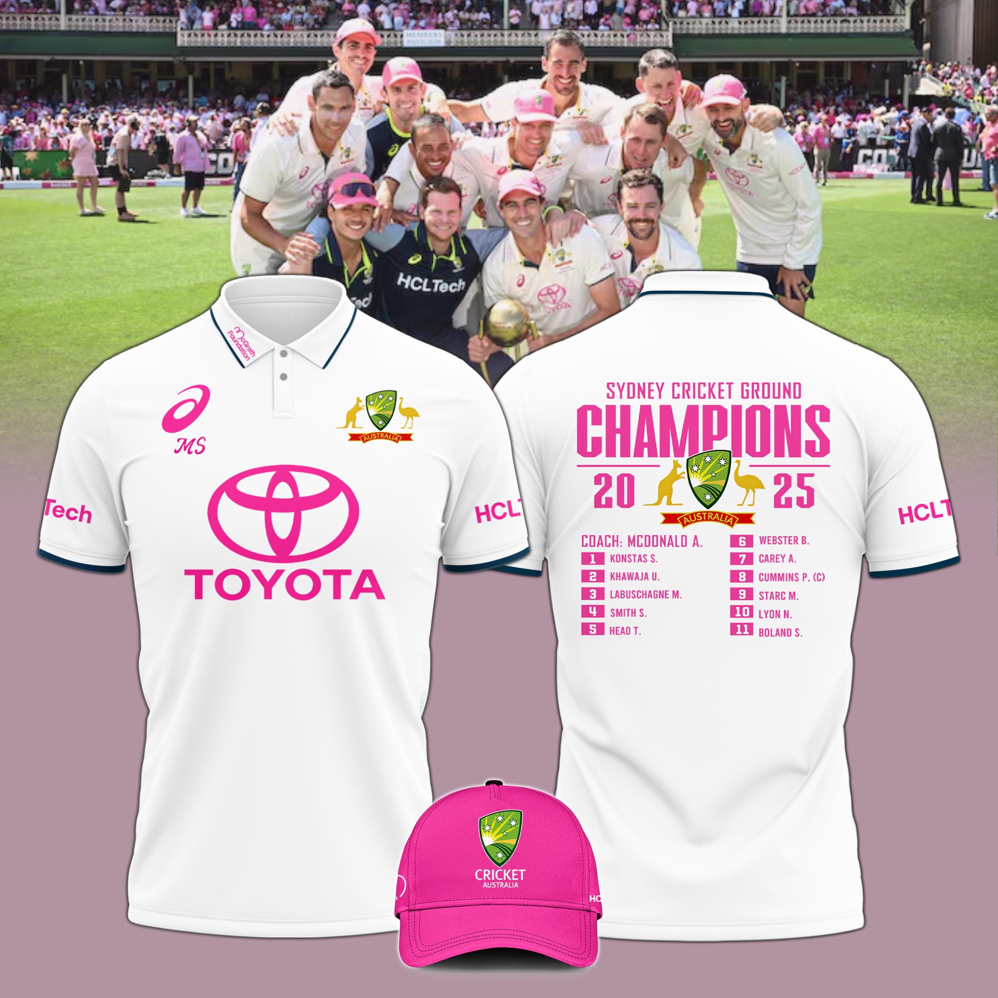 Cricket Team Australia National Shirt Pink Polo CHAMPIONS Breast Cancer Glenn McGrath
