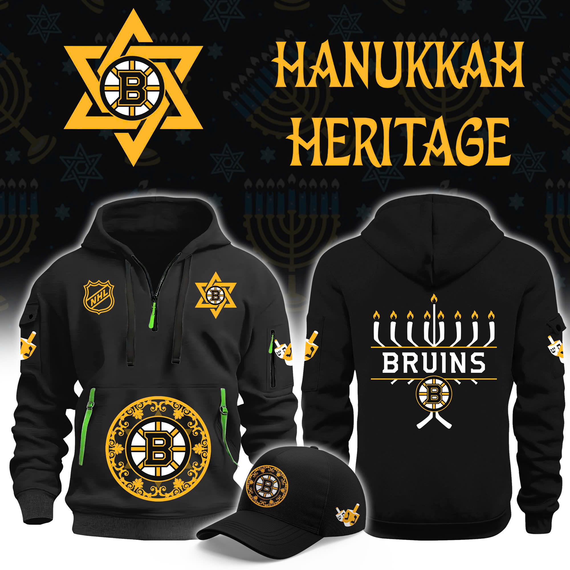 Boston Bruins Hanukkah Black H115 Combo Hoodie | Jogger | Cap