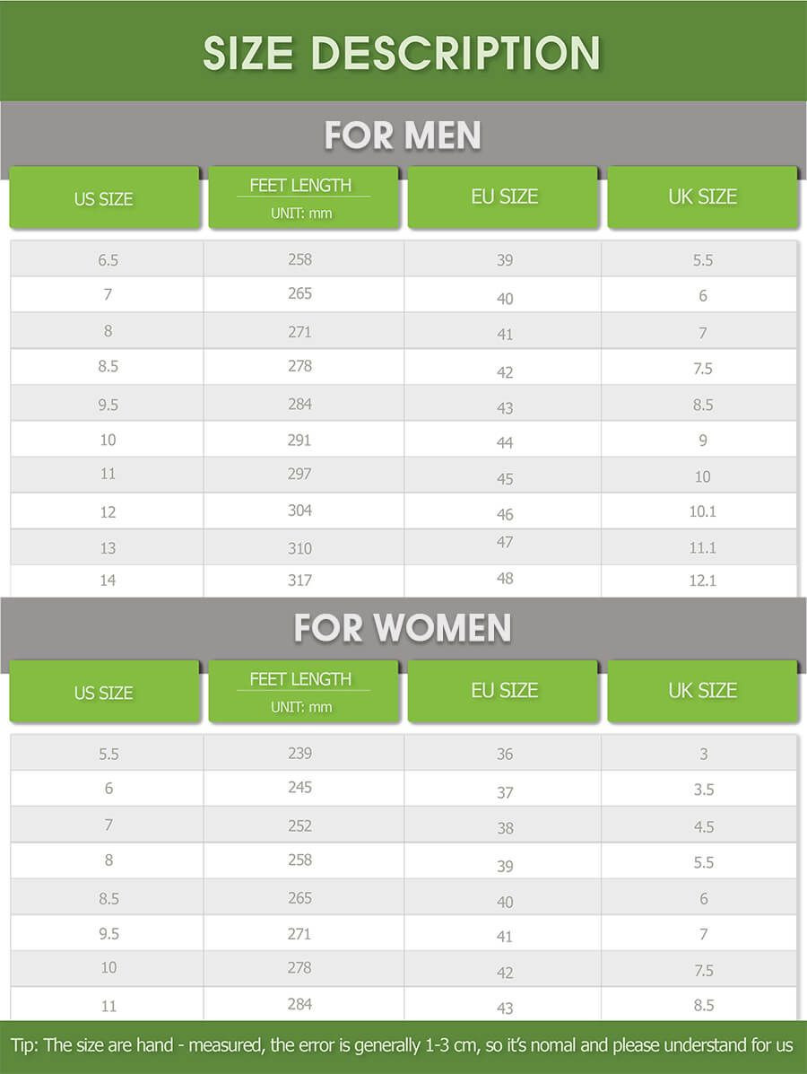 - Size: Available for both Men and Women. Please check the size chart carefully before placing order as we CAN NOT offer return or refund if you choose a wrong size.