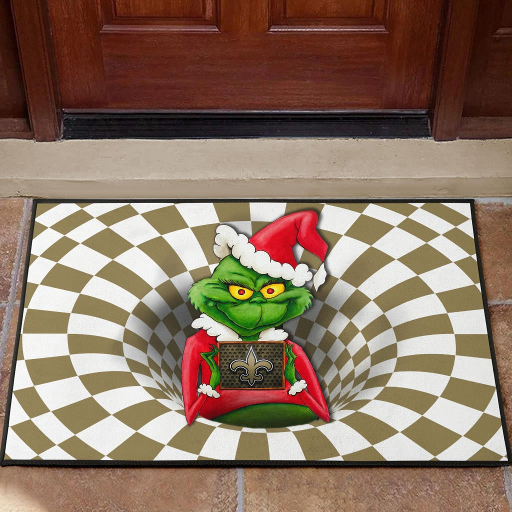 Team Door Mat | Grinch Wearing Santa Clothes Holding New Orleans Door Mat